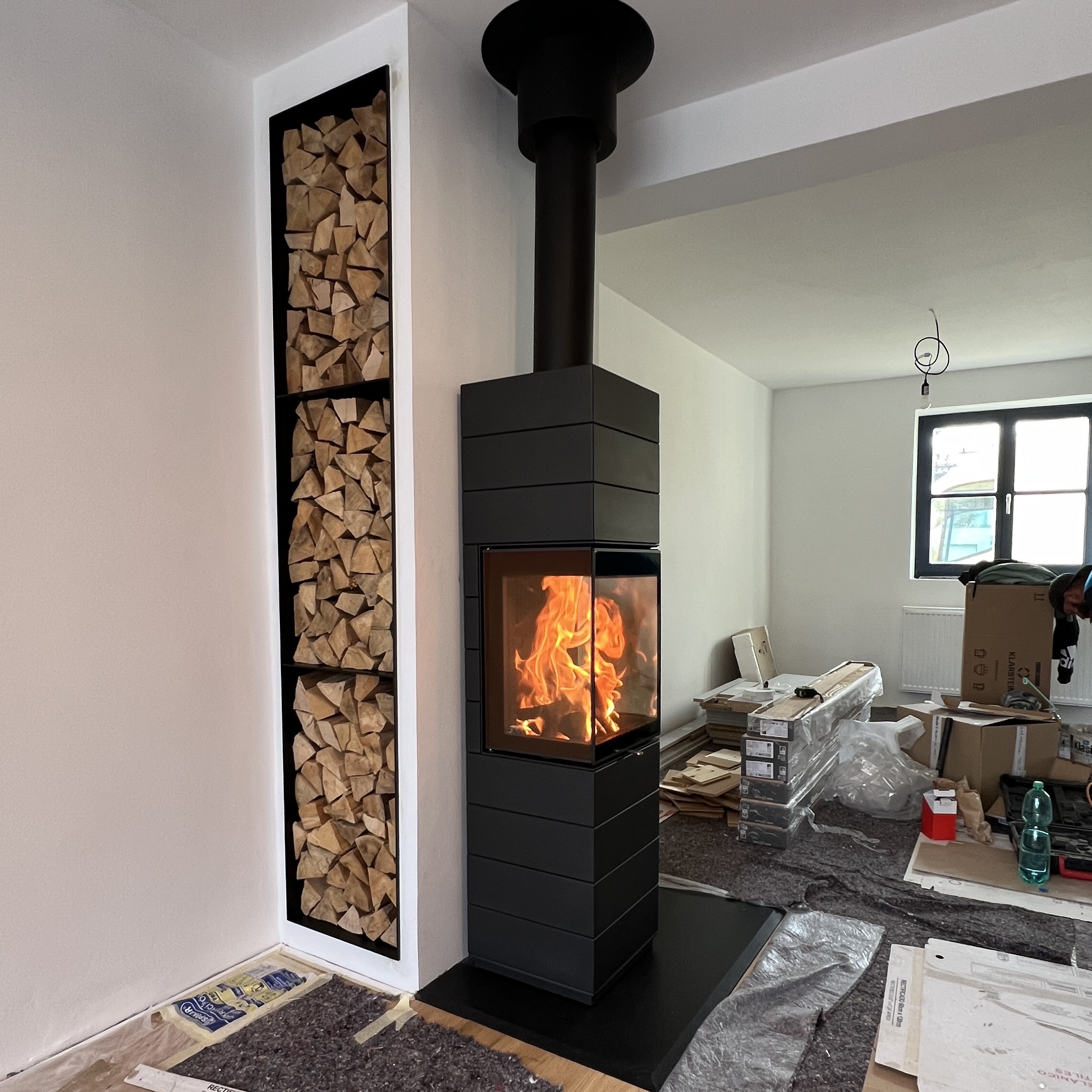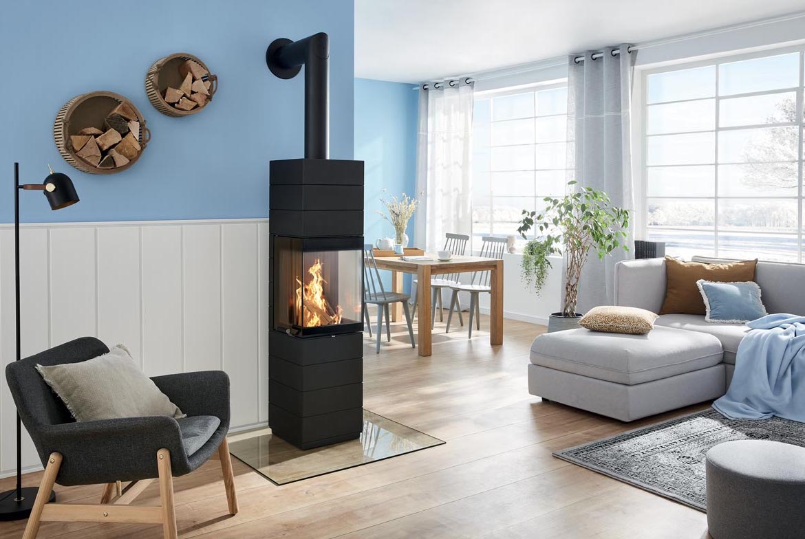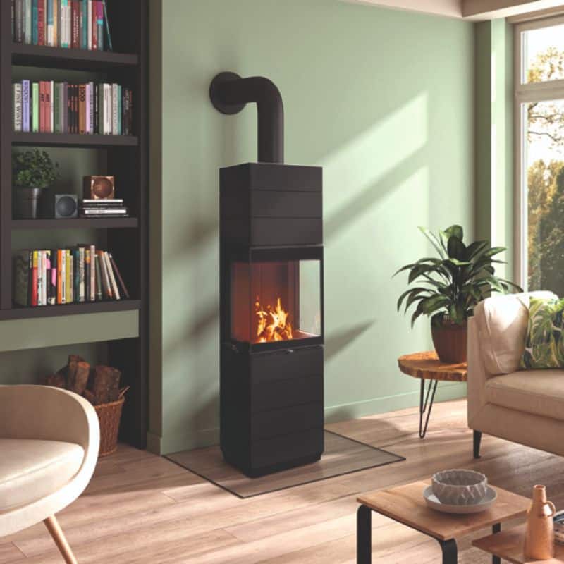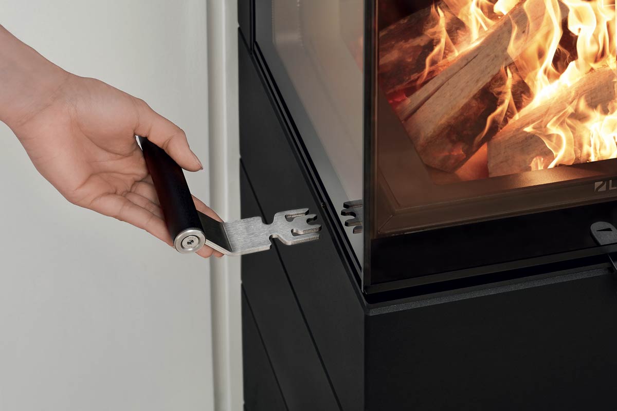 Corna PS har tre generösa glasytor som ger en panoramavy av elden. Glasen är tillverkade av specialglas med ett unikt filter som framhäver lågorna och gör dem extra levande och vackra. Dörren kan öppnas både från vänster och höger och det avtagbara handtaget kan enkelt tas bort för en ren och minimalistisk look när kaminen inte används.